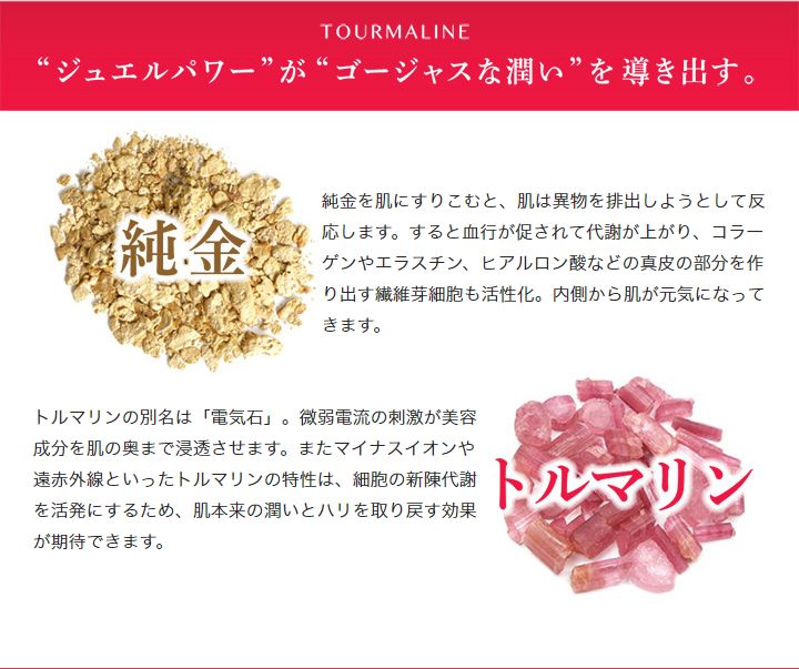 トルマリンゴールドはストレス肌の救世主 トルマリンと純金のジュエルパワーで 弱った肌を内側からサポート。