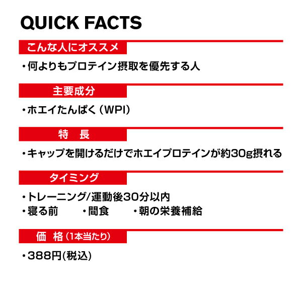 ホエイプロテインを30g配合し、身体作りのゴールデンタイムを逃さず筋肉にたんぱく質を送り込む、利便性を追求するアスリートのためのプロテインドリンク。