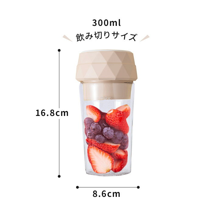 DETAIL サイズ 16.8×8.6×8.6cm 重量 400g 材質 ABS樹脂(本体)、ガラス(容器)、ステンレス(攪拌刃)、シリコンゴム(パッキン) 充電電圧/電流 DC5V/1.5A 機能 モーター速度:20,000回転/1分間、動作時間:30秒/回、充電時間:2-3時間(電池容量700mAH×2) 備考 ※冷凍された果物や野菜は、半解凍してからご使用願います。